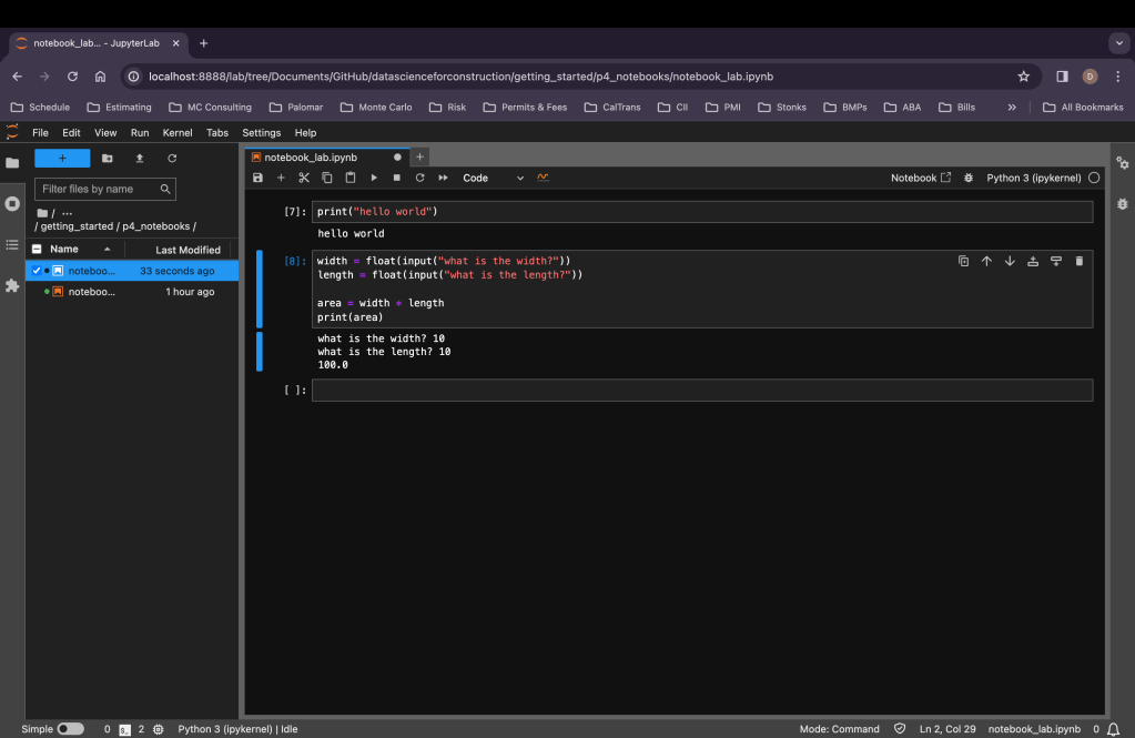 When you run this cell (hit the run button, the one that looks like a play button) below the cell will be a prompt for the width, enter a number here and hit enter or return, the next prompt will appear for the length. Using these two variables area will be calculated and the print() statement will print the results.