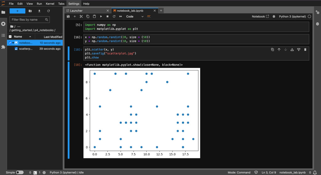 We call the library matplotlib with the alias plt and using the dot operator we call the scatter plot function plt.scatter(), we pass our two arrays for the x and y variables. We are going to want to save our image so using the plt.savefig() function we give our image a name, and we use the plt.show() to print the image out directly in the notebook.